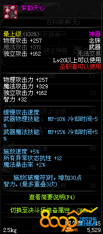 搜索"8090网页游戏"紫韵天心是Dnf端游中的粉色神器,在圣职者职业达到20级以上时便可以进行使用,其获取方式为:在蘑菇怪人夏图处爆落或者直接在NPC阿尔伯特·伯恩斯坦的物品店用阿拉德陨石进行购买,下面就和小编一起来看看这件装备的具体属性如何吧。