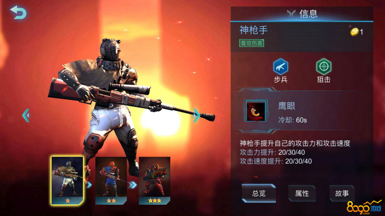 狙击效果:己方场上有3个不同的友军步兵单位狙击护甲+3
