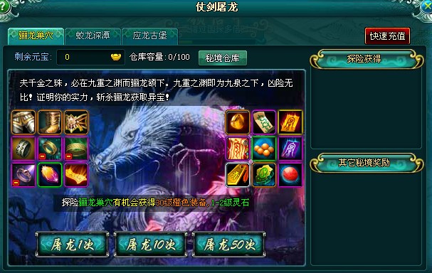 屠龙神装就比较强劲一些,不管是基础属性还是套装属性,都比副本套装稍高一点。目前游戏中放出的屠龙套装共三套,龙泉、精铁和真武。分别可从骊龙巢穴,蛟龙深潭和应龙古堡三大屠龙系列中获得。当然,这只能获得套装的部分部件,另一部分则要靠藏宝图来寻找。