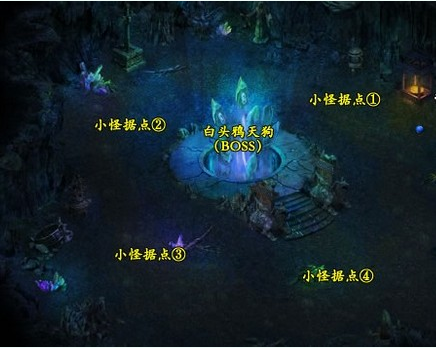 据点①刷新怪物30秒后,据点②刷新怪物,30秒后,据点③刷新怪物,再30秒后据点④刷新怪物,再30秒后,据点①再次刷新怪物,如此类推,当据点④刷新第三次怪物后60秒,地图中央刷新终极BOSS--白头鸦天狗。消灭BOSS后,可获得大量道具。