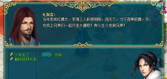 结拜系统中,双方必须组队,且只有2名同性玩家。队伍中队员间好友度达到3000点,并且每位成员等级≥30级,拥有道具【结义令】,组队到NPC虬髯客处,队长点击义结金兰按钮即可完成!如果符合结拜条件,系统弹出提示“XX向你结拜,是否同意”当成员点击确定后,扣除道具,结拜完成;结拜以后,双方组队时防御加成15%,好友度达到9999就可以获得称号“情比金坚”。并有特有结拜技能等你使用。