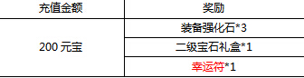 【活动内容】活动期间,玩家每充值200元宝即可获得丰富奖励返利,同时获得一个饱含幸运祝福的转盘幸运符,可以在幸运转盘活动中使用。每天限领50份充值奖励。