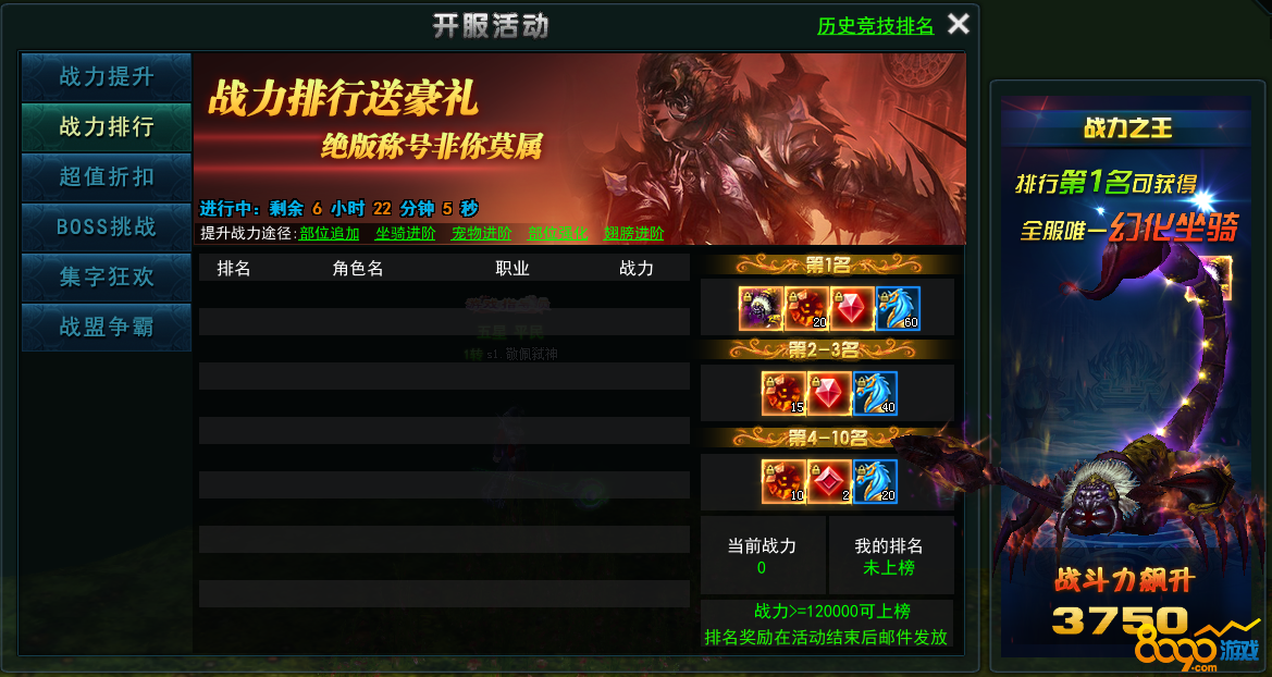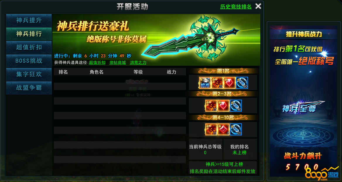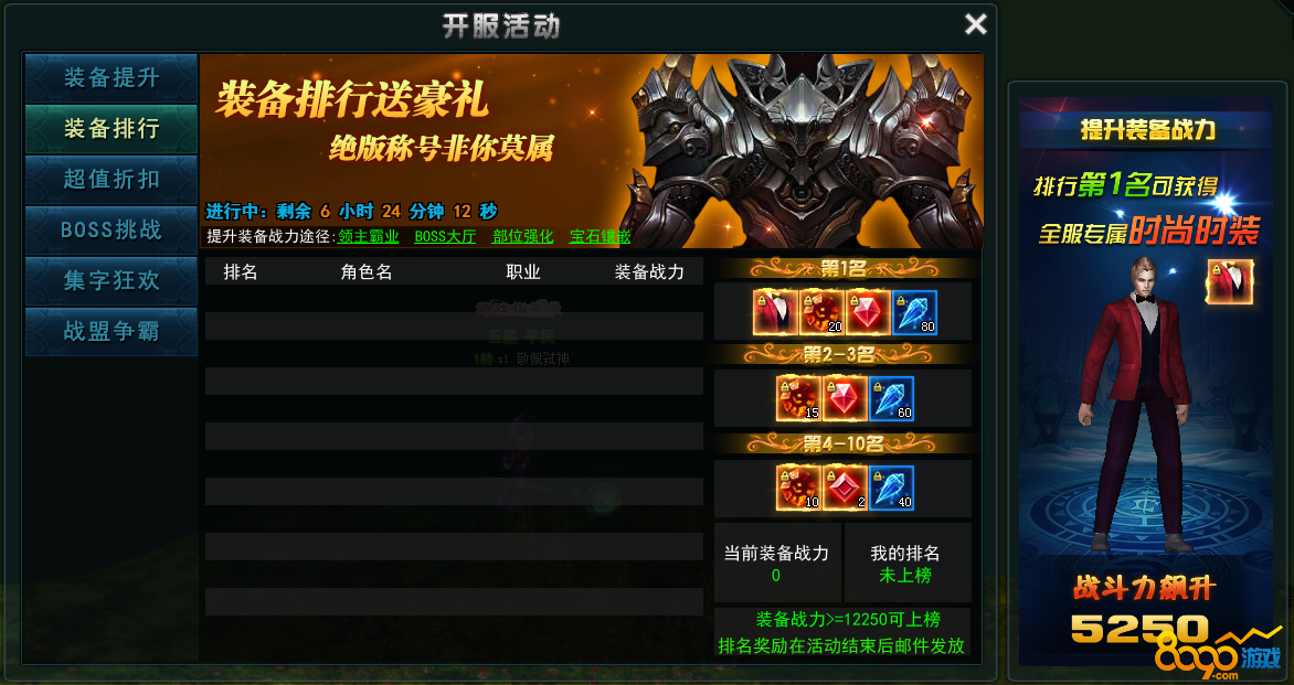 活动规则:活动期间装备提升至相应战力可领取各种极品道具!战力越高奖励越丰厚哦!排行服务器前列更可获得排行奖励!