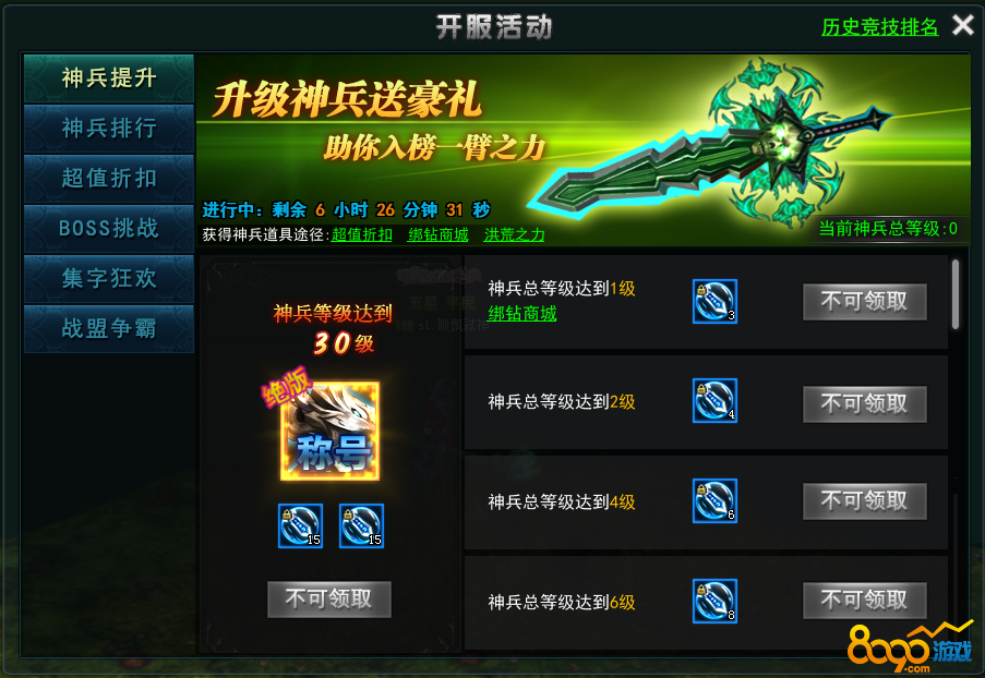 9) 神兵达到30级可领取:绝版称号(神兵大师)、初级神兵石*30