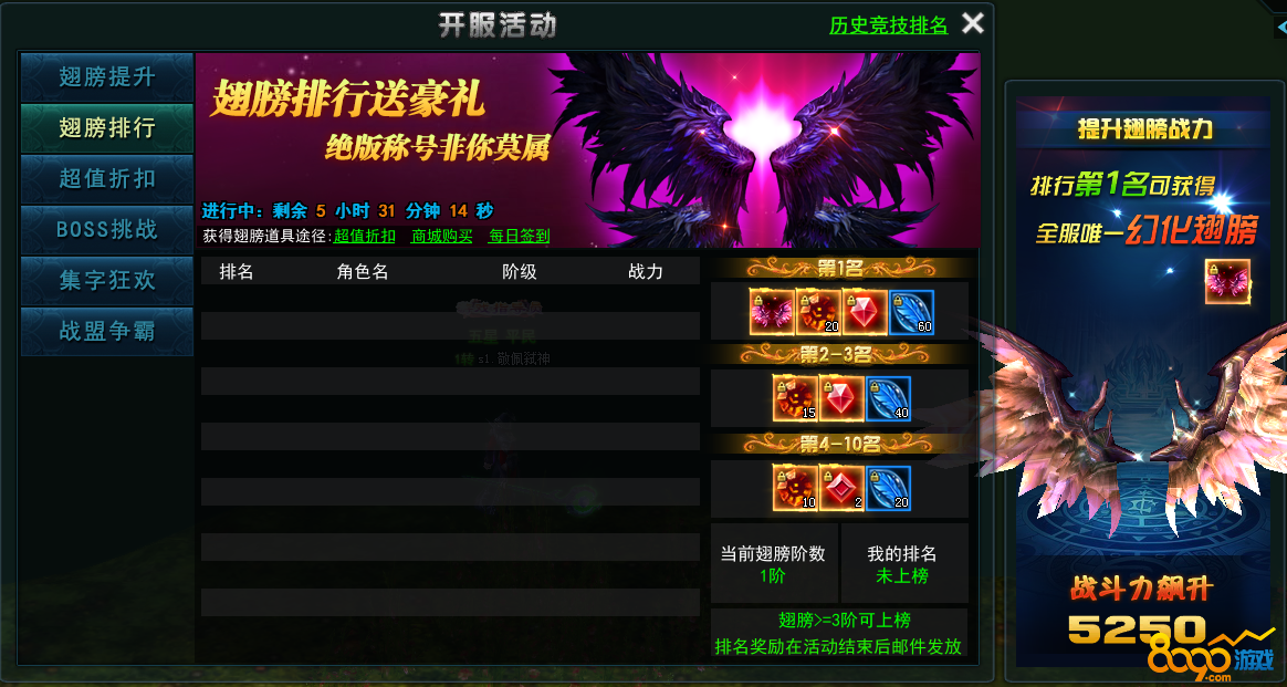 活动规则:活动期间翅膀升至相应阶数可领取各种极品道具!等级越高奖励越丰厚哦!排行服务器前列更可获得排行奖励!