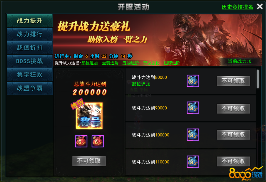 9) 战力达到200000可领取:绝版称号(登峰造极)、6阶属性果实包*2