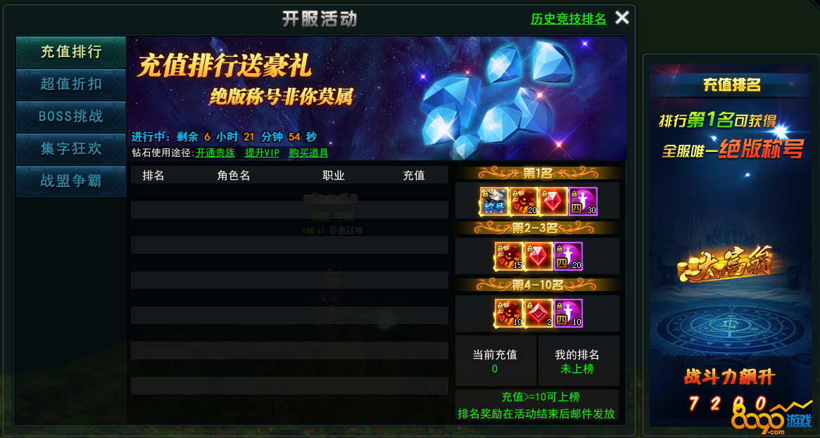 活动规则:活动期间充值排行越高可获得的奖励越丰厚!