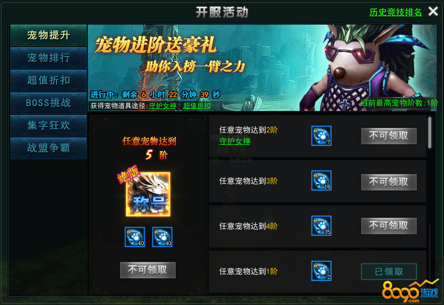 5) 宠物升至5阶可领取:绝版称号(萌宠大师)、初级宠物进阶石*80