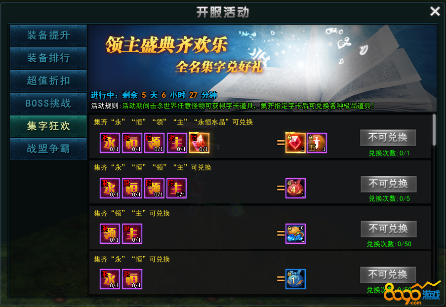 活动规则:活动期间击杀世界任意怪物可获得字卡道具,集齐指定字卡后可兑换各种极品道具!