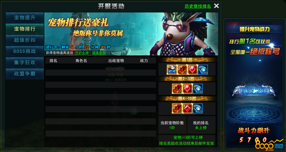 活动规则:活动期间宠物升至相应阶数可领取各种极品道具!等级越高奖励越丰厚哦!排行服务器前列更可获得排行奖励!