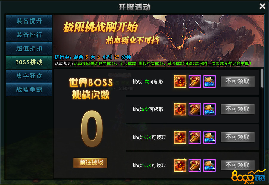 活动规则:活动期间参与挑战世界BOSS、中立BOSS、幽暗地牢BOSS即可得到超级豪礼,次数越多奖励越丰厚哦!击杀90次后还可获得强力称号!