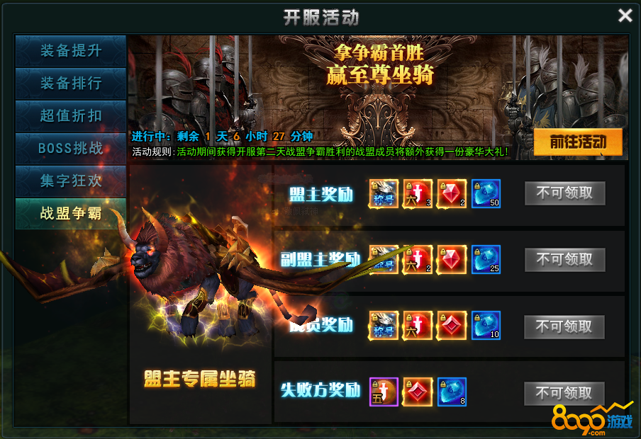 活动规则:活动期间拿下开服第二天战盟争霸的战盟成员将额外获得一份豪华大礼!