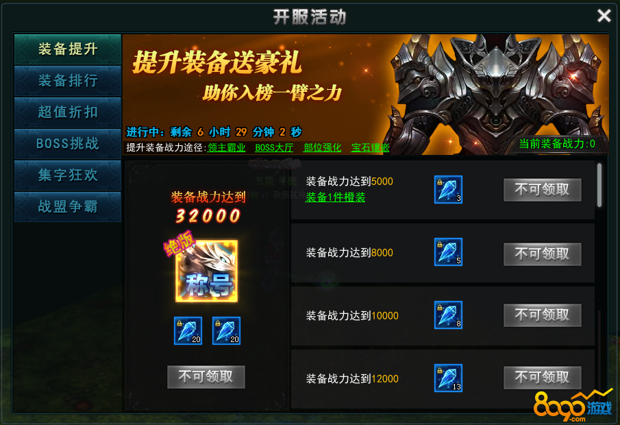 9) 装备战力达到32000可领取:绝版称号(远近驰名)、初级强化石*40