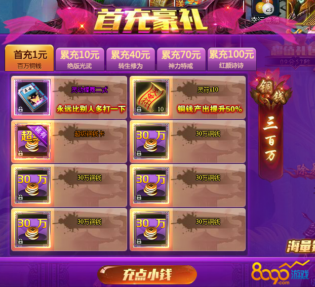 首充1元可有机会获得灵动蝶舞二式技能,可以大幅度的提高战斗中所造成的伤害。还有机会获得稀有超级铜钱卡,灵符,更有三千万铜钱等您来拿,海量铜钱可以让你技能等级飙升哦!