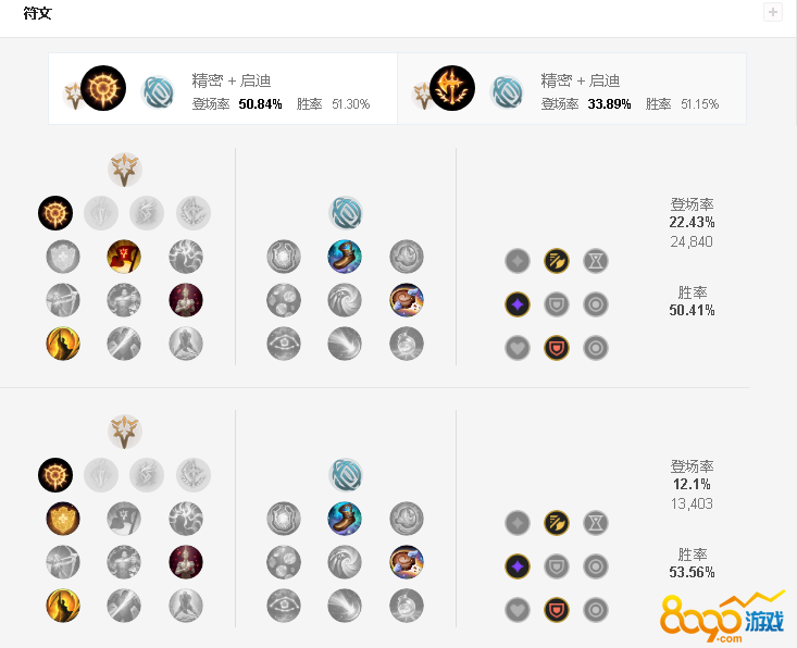 关于符文天赋方面一共有两种主流的带法,一是强攻,二是精密,这两套符文的副系统一选择启迪系的鞋子加饼干来增加对线能力和后期操作空间。可以看到在实战中的表现是征服者更胜一筹,以略微的胜率优势领先于强攻。当然带什么符文还是要根据地方阵容来选择。