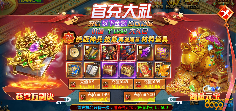 首充价值1888元大礼包等你领取,绝版神兵、技能,再送海量材料道具,苍穹万剑诀、海量元宝不容错过!