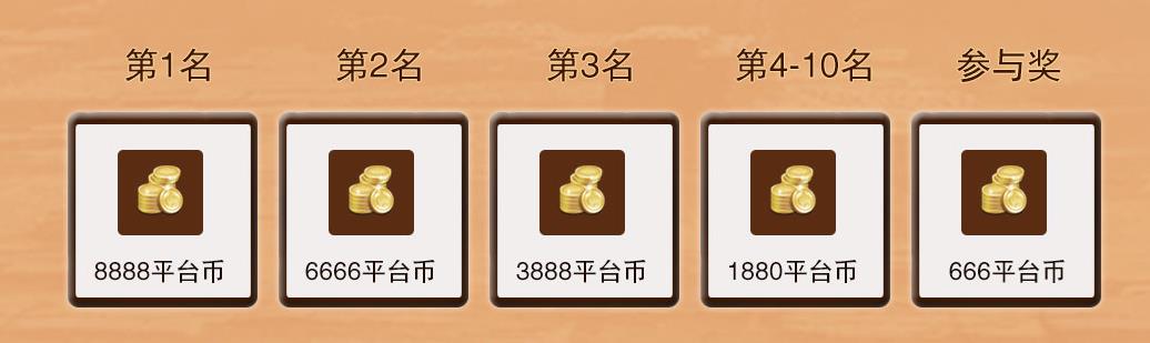 2、玩家累计实际充值5000元且不在前10名内的玩家可获得丰厚的参与奖励666平台币;