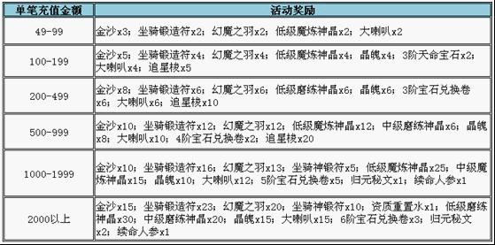 1.活动期间不限制充值限制,每日首笔充值达到指定金额即可获得相应礼包(每日最多可获得一个礼包)