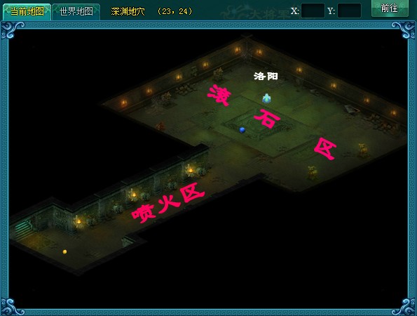 进入副本后,玩家将进入喷火走廊,走廊有五个喷火龙头,每隔一段时间,龙头喷出火焰,玩家触碰到火焰将会被传送回走廊入口,玩家需要避开火焰往前行进,可以多利用鸟渡术与坐骑,把握时机,便能顺利通过