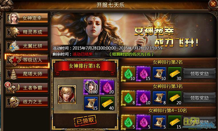 【活动内容】截止开服当天23:59:59女神排行榜前10名玩家将获得丰厚奖励