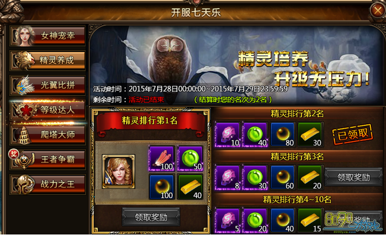 【活动内容】截止开服第2天23:59:59精灵排行榜前10名玩家将获得丰厚奖励