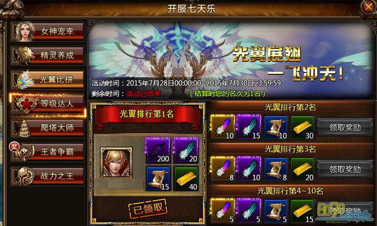 【活动内容】截止开服第3天23:59:59光翼排行榜前10名玩家将获得丰厚奖励