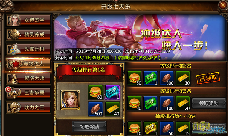 【活动内容】截止开服第4天23:59:59角色等级榜前10名玩家将获得丰厚奖励