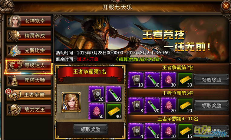 【活动内容】截止开服第6天23:59:59王者争霸排行榜前10名玩家将获得丰厚奖励