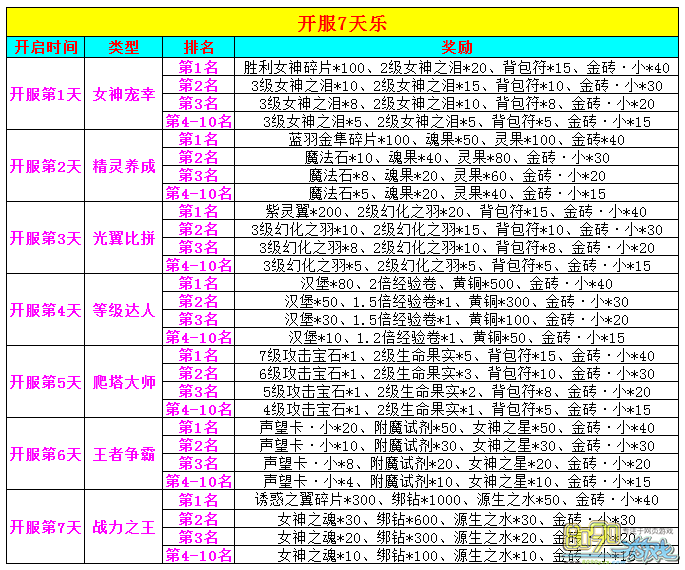 【活动内容】新服开启后前7天,冲上排行榜的玩家可领取丰厚奖励(每天统计的排行榜类型不一样哦)