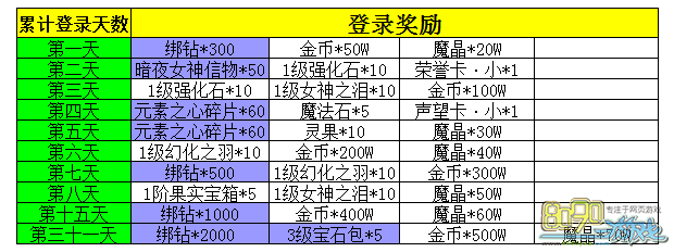 【活动内容】玩家累计登录一定的天数就可以点击右上角图标“奖励大厅”领取登录奖励,大量绑钻、宝石包裹、女神信物、