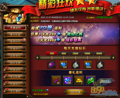 【活动内容】精彩狂欢包含充值返利、幸运彩票、消耗活动、暴击轮盘、登陆好礼、宝箱活动;(点击查看更多内容)
