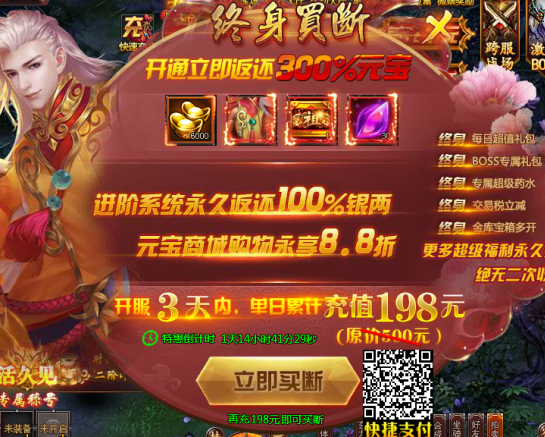 活动期间,玩家当天累计充值满198元即可开通终身买断,享受特权待遇。活动结束后,终身买断特权价格恢复为当天累计充值500元才可开启。