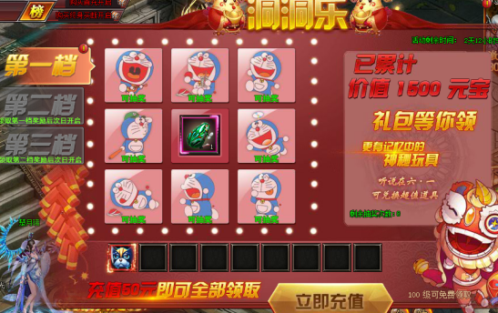 活动期间,玩家可在活动界面进行抽奖,活动共有3档奖励,领取上一档奖励后次日才能开启下一档内容,每档奖励有9次抽奖机会,充值对应金额后可全部领取所抽道具。