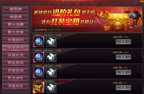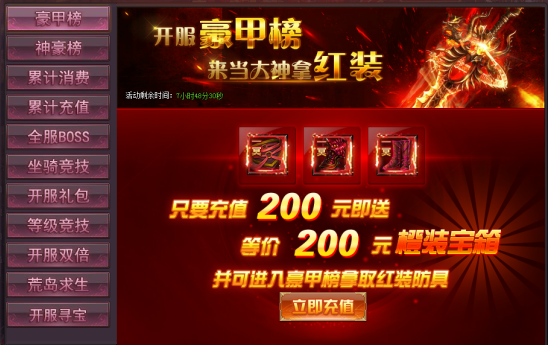 活动期间,玩家累计充值满200元即可获取进入豪甲榜资格,领取极品装备