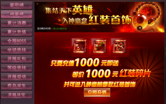 活动期间,玩家累计充值满1000即可获取进入神豪榜资格,领取红装首饰装备