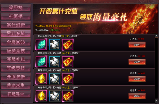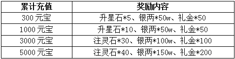 活动期间玩家累计充值元宝达到300、1000、3000、5000,即可领取对应档次奖励