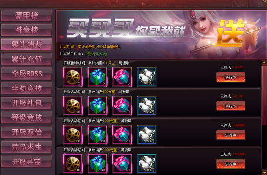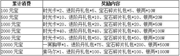 活动期间玩家累计消费一定数量的元宝,即可领取对应档次奖励