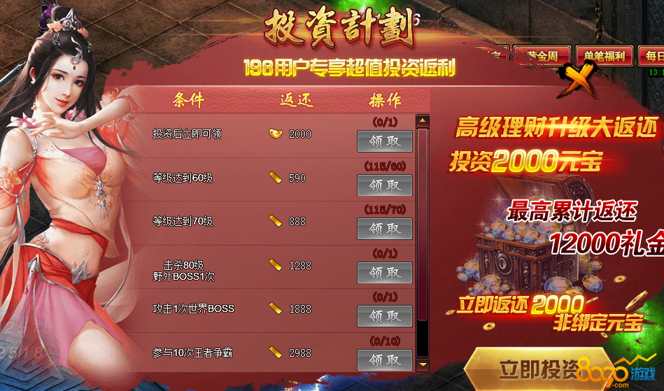 投资计划稳赚不赔198终身买断用户专享超值投资返利,高级理财升级大返利,投资2000元宝最高累计返还12000礼金,立即返还2000,非绑定元宝。投资后立即可领2000元宝,等级达到60级,可返还590礼金,等级达到70级可领取888礼金,击杀80级野外BOSS一次可领取1288礼金,攻击1次世界BOSS可领取1888礼金,参与10次王者争霸可领取2988礼金,参与1次天降横财活动可领取4358礼金。