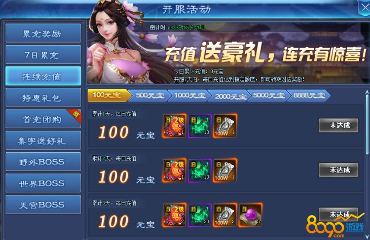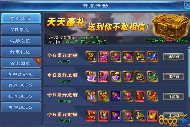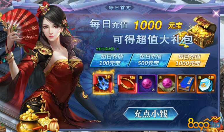 3、每日首充:分为100元宝、500元宝、1000元宝档,每天奖励都不同,达到条件即可获得当前最有用性价比超高的道具奖励哦。