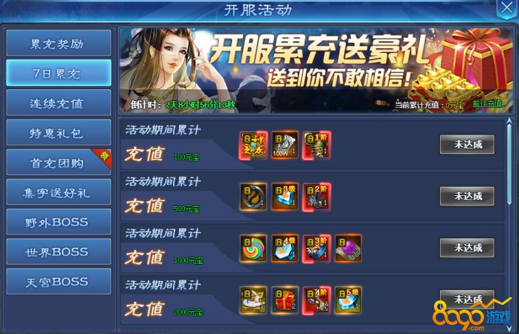 开服7天活动期间,每日累计达到一定额度的充值即可领取丰厚大奖。