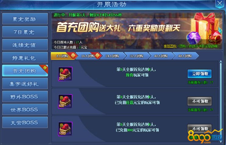 当本服首充人数达到指定人数,即可领取对应该的奖励。(首充人数越多,团购奖励越丰富。)