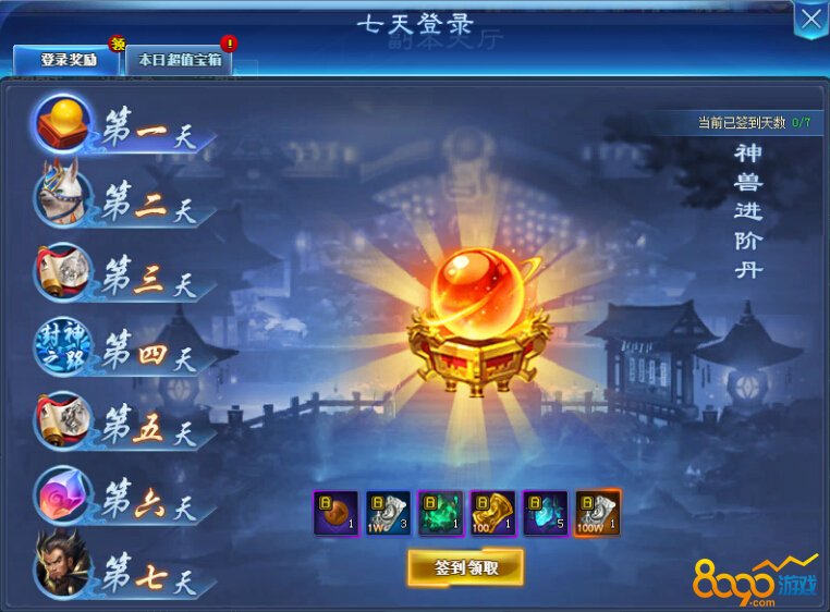 第1天可获得-神兽进阶丹 *1、1万银两卡*3、洗炼石*1、100绑定元宝卡*1、装备锻造石*5、100万银两卡*1