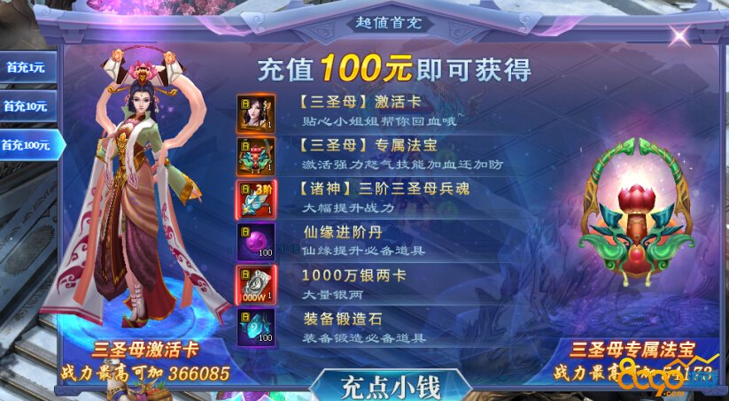 1、首充1元:此活动是终身首充活动,终身只能参与一次。档次分为1元、10元、100元。在游戏内充值达到条件即可获得钻石特权、金色+7列王武器、绝版仙武-缤纷美味、80级超级经验丹,绝版加血仙缘-三圣母等等。