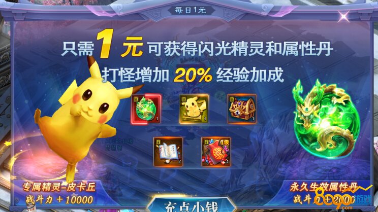 2、每日1元:每天充值1元就可以获得专属精灵-皮卡丘,不但会增加战力10000,而且激活皮卡丘打怪经验增加20%。还有永久属性丹获得,吞噬一颗战力加2000.简直就多多益善~
