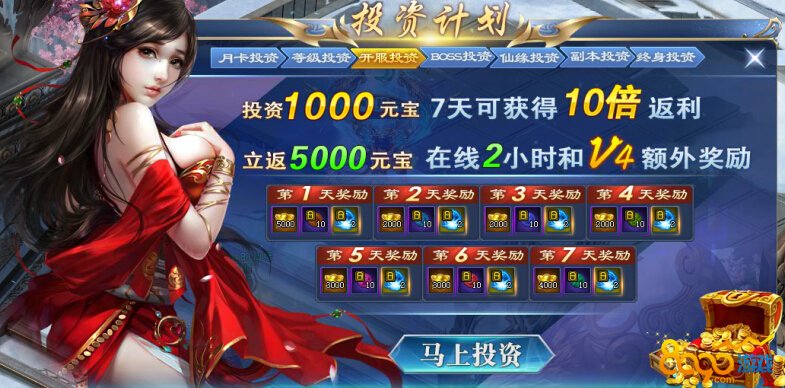 活动期间内购买不同投资,可获得超丰厚返利。开服投资更是直接10倍返利,在线2小时和V4还有额外奖励可领取。