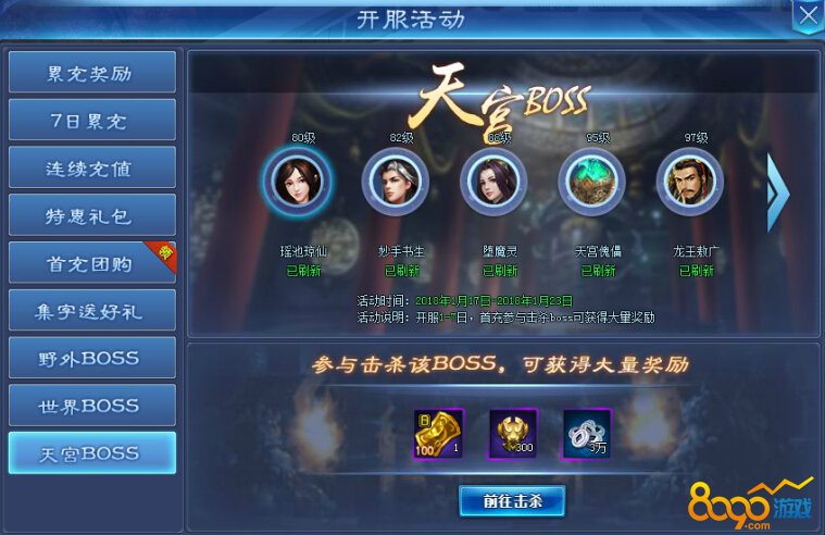 活动期间内玩家首次击杀天宫BOSS即可获得大量奖励