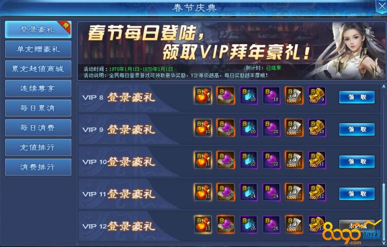春节庆典期间,根据VIP等级玩家每天登录即可轻松领取奖励,VIP12可领取以下全部奖励,非常划算哦~