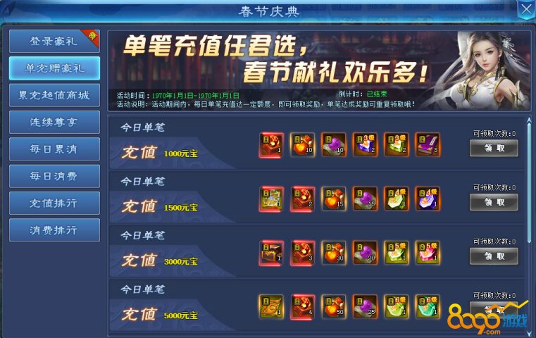 活动期间内,每日单笔充值达到一定额度即可领取奖励,单笔充值达成奖励可重复领取哦