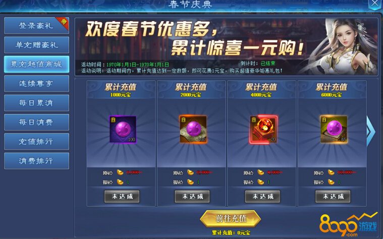 活动期间,累计充值达到一定额度,即可花费1元宝,购买超值豪华钜惠礼包!