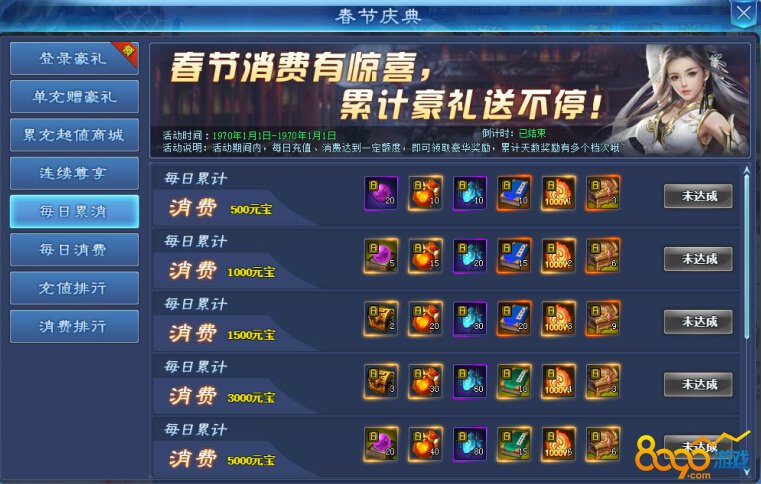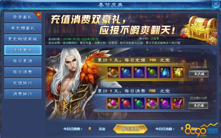 活动期间内,每日充值、消费达到一定额度,即可领取豪华奖励,累计天数奖励有多个档次哦~
